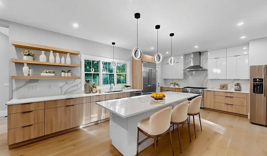 Conveniently located on a dead-end street between Chestnut Hill & Newton Center. This stylish home blends modern convenience with timeless charm & architectural detail. It’s layout that makes efficient use of space while providing a warm and inviting atmosphere. The spacious main living & dining area features an open and airy floor plan with high ceilings that enhance the sense of light and space. A perfect setting for both everyday living and entertaining, with ample room for relaxation and gatherings. The kitchen is beautifully appointed with sleek stainless-steel appliances & quartz countertops. Gas fireplace, an abundance of closet space, a pantry, first floor bedroom & full bath round out the floor. The second floor boasts two more bedrooms (one with a balcony), walk in closets, ensuite baths and laundry. The finished basement provides mant options and includes a living space, bedroom, full bathroom, separate office space, second laundry room and direct access to the garage.